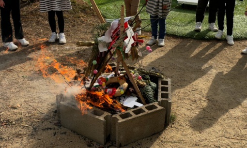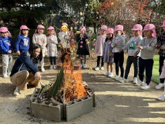1月15日(木)に園庭で「ミニとんど」を行いました。園庭のお山で学年ごとに、幼稚園に飾っていたしめ縄や餅花、家から持ってきてくれたお正月飾りを燃やして、年神様を空に見送りました。煙を見ながら今年一年病気や怪我をせず元気に過ごせるようにとお願いをしました。