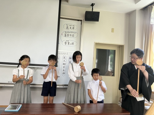 今日は、「神様ってなんだろう?」や、「神社での作法」についての授業となりました。