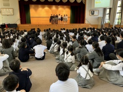 新1年生にとっては初めての全校朝会。2~6年生のお兄さん・お姉さんたちが「ようこそ1年生」を歌い、笑顔と手拍子で温かく迎えてくれました。1年生は、ペアの6年生に手を引かれて講堂へ入場。音楽朝会委員会の進行のもと、自己紹介やリズム遊び、音楽クイズなどが行われ、はじめは緊張した様子も見られましたが、次第に笑顔が増え、楽しみながら参加することができました。