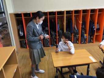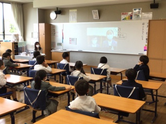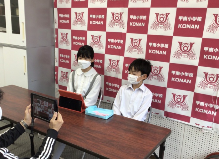 今日のコーナーでは、1年生の教室から中継を行い、新1年生にインタビューする様子を、全校生に観てもらいました。