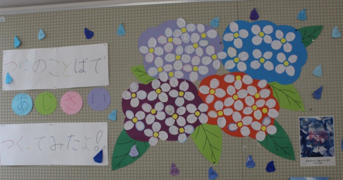 つゆのことばで「あじさい」つくってみたよ(学校図書館)