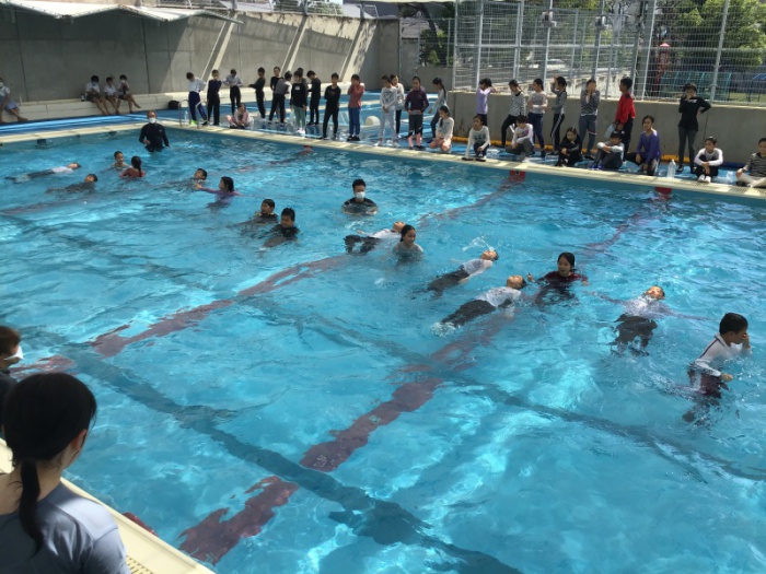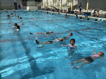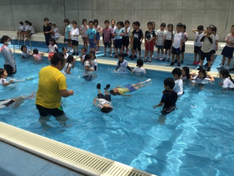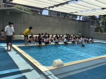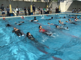 今年も安全に夏を乗り切ってほしいという願いの元、服を着たまま誤って水に入ってしまった時に、「自分の命を守る方法」と「身の回りの人の命を守る方法」を、実技を交えながら学びました。