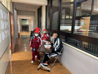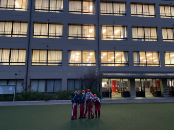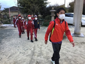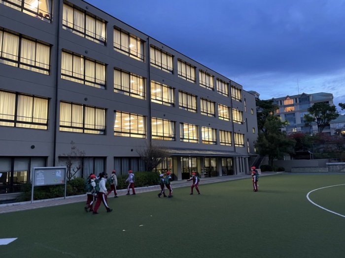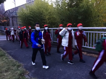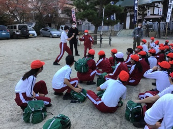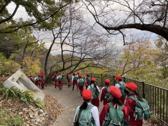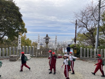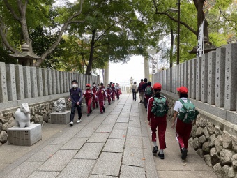 児童はまだ外の暗い時間に家を出て、6:30に学校に集合します。早朝の静けさを楽しみながら、学年ごとに保久良神社まで約4キロの道のりを歩きました。お天気が心配されましたが、紅葉や柿の木々を見ながら秋の訪れを感じることができました。