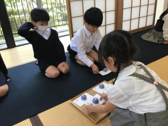 正しい座り方やお辞儀の仕方、ものの渡し方などを学んだ後で、実際に子ども同士でお茶とお茶菓子を運び、いただきました。