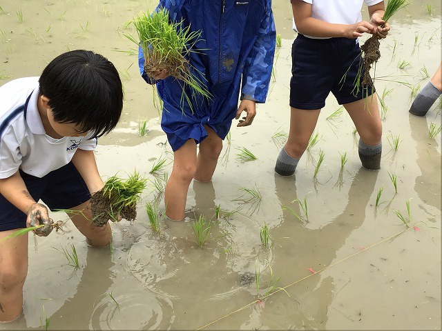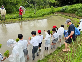 晴天とはいきませんでしたが、どうにか雨も弱まり田植えを行なうことができました。子どもたちは田んぼに恐る恐る足を入れ、頑張って稲を植えていました。初めは慣れない様子でしたが、だんだん手つきが慣れていました。