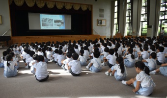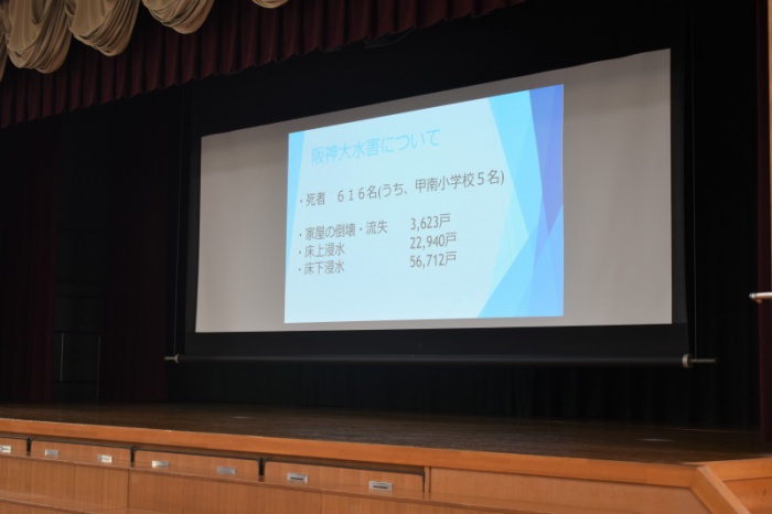 昭和13年の梅雨の時期、神戸市では未曾有の降水量を記録し、616人の方が亡くなられました。甲南小学校に通っていた人も5名亡くなられたことから、毎年7月5日に水害についてのお話を聞き、黙祷を捧げています。