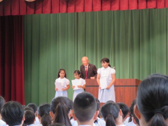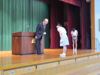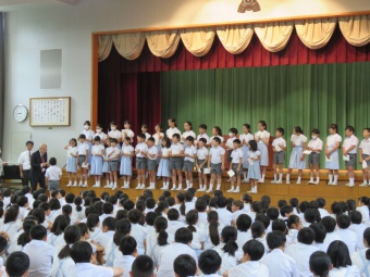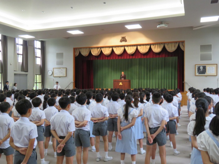 講堂にて終業式を行い、校長先生からは1学期の締めくくりについてや、夏休みの過ごし方についてなどお話いただきました。