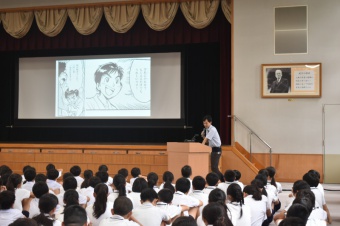 平生先生の一生を描いたマンガ本を見ながら、学校設立までどのような暮らし・活躍をしてきたのか、詳しく知ることができました。