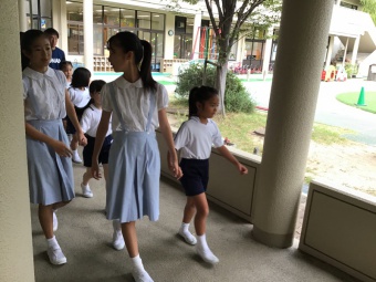 音楽朝会が終わったら、6年生が1年生の手を引いて教室まで送ります。これからも仲よくしてね。次の音楽朝会も楽しみだね!