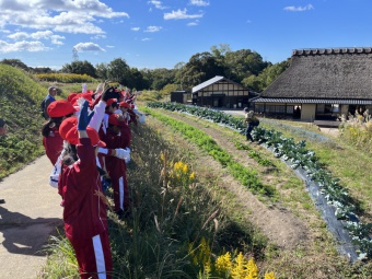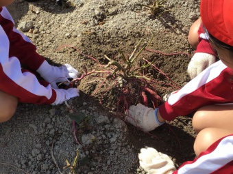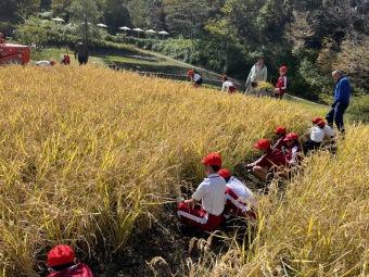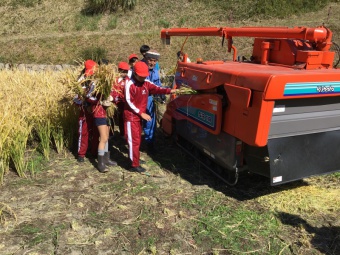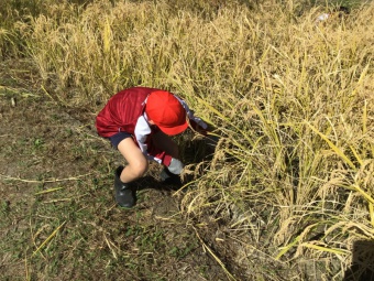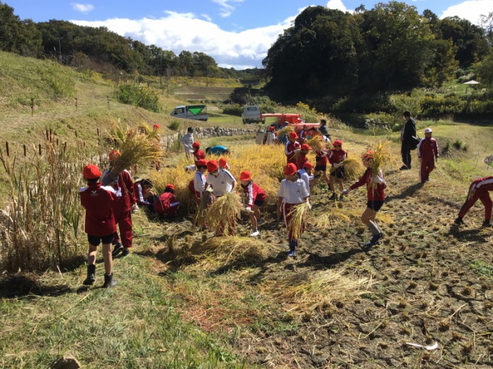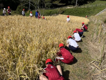10月28日(日)に、あいな里山公園で「稲刈り体験」と「芋掘り体験」を行いました。夏に植えた稲を鎌を使って刈り取り、コンバインで脱穀しました。子どもたちは手際よく稲を刈り取り、「もっとやりたい!」と楽しそうに活動に取り組みました。