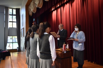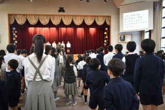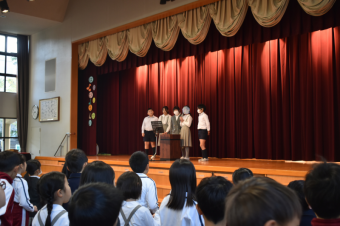 今日の全校朝会は、音楽朝会でした。今月の歌の「希望のバトン」をみんなで歌った後、先日行われた「学年対抗歌合戦」の順位発表と表彰式も行われました。