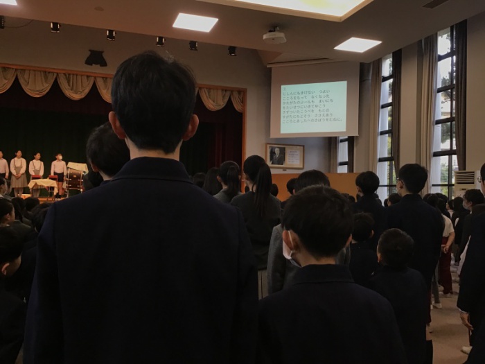 本日は、音楽朝会で誰も悲しい思いをしないようにするためにはどうすれば良いかを考え、亡くなった方々のことを思いながら「しあわせはこべるように」を全校で歌いました。