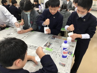 スライム作りでは、3種類の身近なものを使うだけでよく伸びるスライムが作れることに子どもたちも驚き、