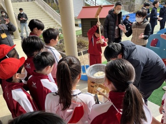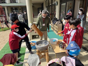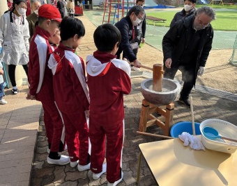 自分達でついたお餅に加え、保護者の方々による豚汁の炊き出しもいただきました。1年間育てた餅米でできたお餅を食べ、収穫を喜びました。