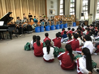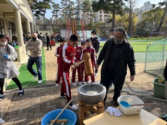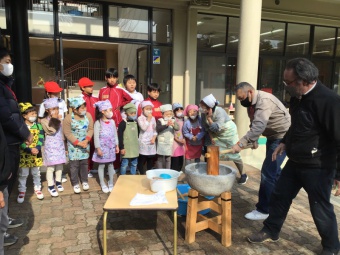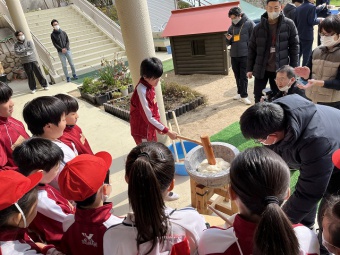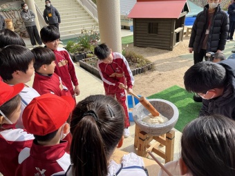 最初に幼稚園、5年生、甲南中高、甲南女子中高5年生で集まり、甲南中高ブラスバント部の演奏を聴きました。その後、5年生が中心となって栽培、収穫を行った餅米で、お餅つきを行いました。