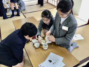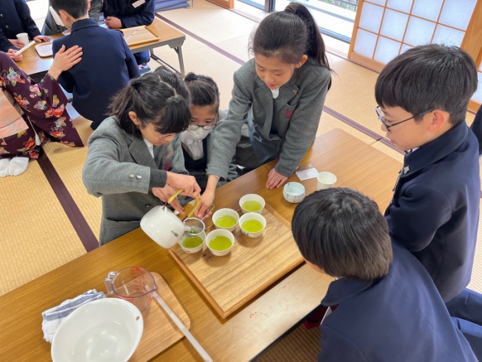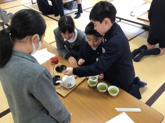 日本文化学習は、各学年毎年3回行なっております。5年生の3回目の日本文化学習では、訪問時の作法やお茶の淹れ方について学習しました。訪問時の作法では、ふすまの開け方閉め方や、上座下座などの座り方などについて学習しました。また、お茶の淹れ方では、深蒸し煎茶の淹れ方についてグループで協力しながら挑戦しました。その後、自分たちで淹れたお茶とお菓子をいただきました。