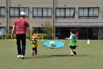 ボール運びリレー、宝物リレー、リングバトンリレーを行い、最後のリングバトンリレーでは、実際に運動場のトラックを使用して本格的なリレーにも挑戦しました。
