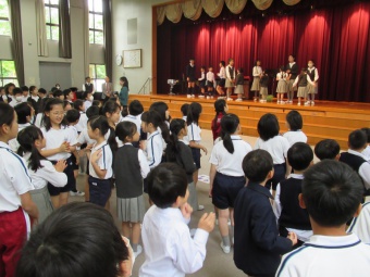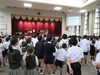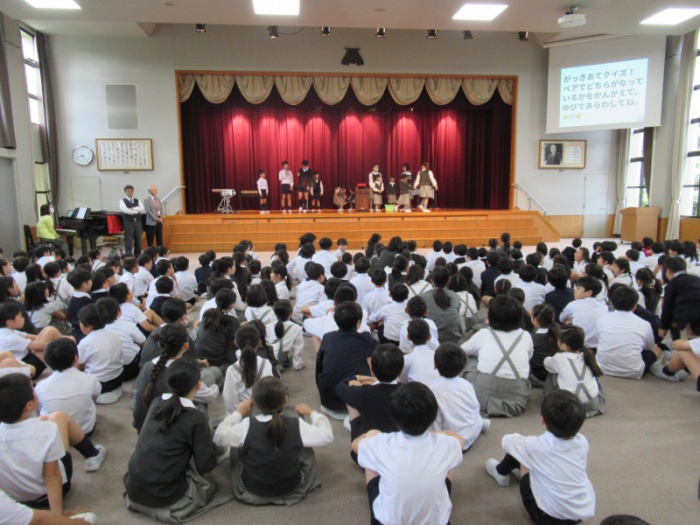 5月の音楽朝会がありました。音楽委員会の6年生が企画して、今回は音楽ゲームと楽器あてクイズ、今月のうた「しあわせなら手をたたこう」「勇気100%」を歌いました。