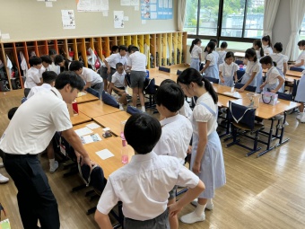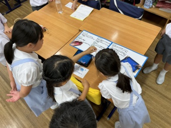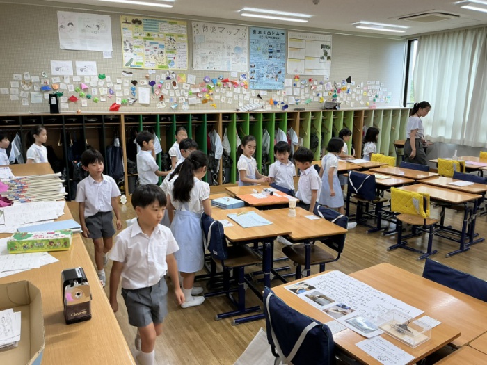 朝会の時間に「夏休み作品展」を行い、全学年の自由研究をじっくり見て回りました。