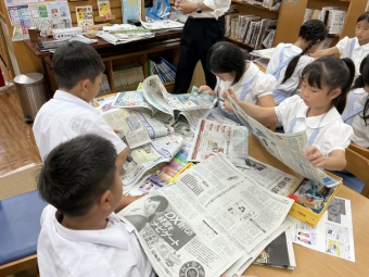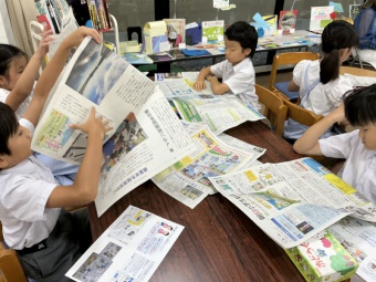 まずは、神戸新聞の写真ニュースや朝日小学生新聞、毎日小学生新聞、読売KODOMO新聞の中から、自分が「おもしろい!」「気になる!」と思った記事を一つ選びました。選んだ理由をみんなで発表し合うと、「へえ、そんなところに注目したんだ!」と新しい発見がいっぱいでした。