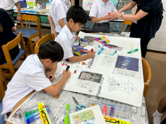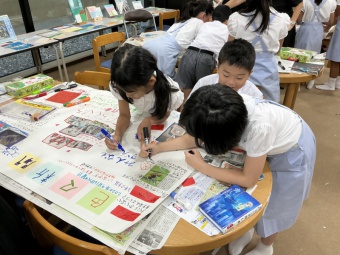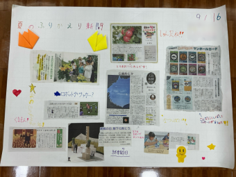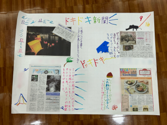次に、どの記事をトップニュースにするかを相談しながら、模造紙に記事を貼ってレイアウトを考えました。最後に感想やコメントも書き加えて、世界に一つだけの「まわしよみ新聞」が完成しました。