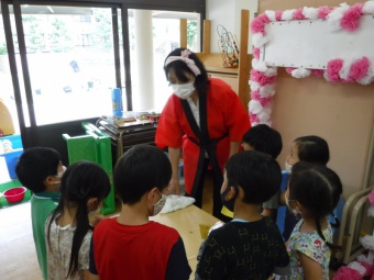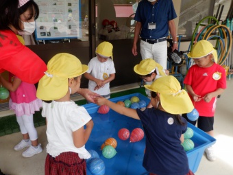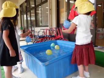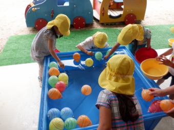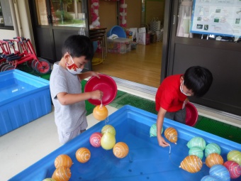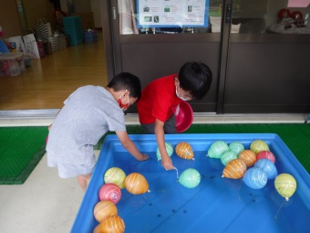 先日、幼稚園にヨーヨー釣り屋さんが来てくれ、ヨーヨー釣りをしました。ヨーヨーを釣っている時はとても真剣で、取れた時は笑顔いっぱいでヨーヨーを見せてくれました。「僕は4個も取ったんだよ!」「紐が切れずにいっぱい釣れた」「欲しかった色のヨーヨーゲット!」など友達と言い合ったり、すみれ組の子どもたちの中には初めてヨーヨーつりをする子もおり、それぞれ思い思いに楽しんでいました。