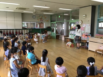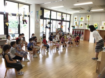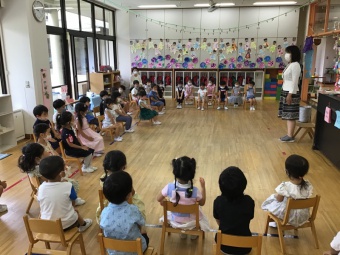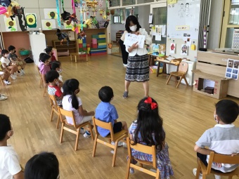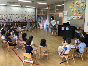 コロナ禍で緊急事態宣言が出たりしましたが、大きな怪我や病気もなく、無事に1学期終業式を迎えることができました。園長先生から1学期頑張ったことを褒めていただき、子どもたちは嬉しそうでした。そして、夏休みの過ごし方を聞いて、式を終えました。