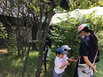 その後の園庭遊びでは、水遊びをする子ども達もあれば、お砂場で遊んだり、うさぎを見たり、またブルーベリーの実を見つけて美味しそうに食べたりと、思い思いにたくさん遊んでいただました。おひさまがいっぱいで、熱中症が心配されましたが、楽しく過ごしていただけました。