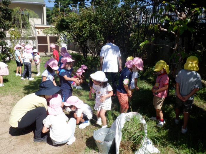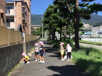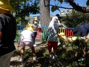 なかなか抜けない草も、友達や先生と力を合わせることで勢いよく抜けます。それが面白くて、顔を見合わせて笑い合ったり、抜けた草を両手いっぱいに運んだりと、大活躍の子ども達でした。一番小さいすみれ組さんも、芝生の上の隅々まで落ち葉や松葉を拾ってくれました。年長さくら組は、たんぽぽ組の頃から外周道路の草抜きをしてくれていたので、今回も手慣れた様子で5人のさくらさんが外回りにも取り組んでくれました。