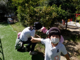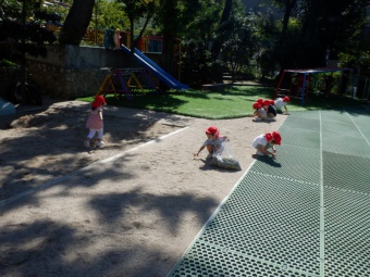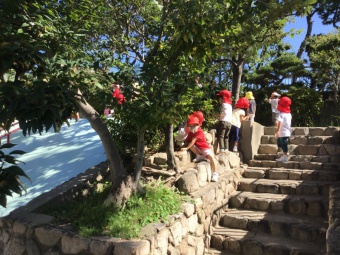爽やかな秋晴れの下、今日は幼稚園のみんなで園庭を掃除しました。お山でチームに分かれて、草を抜いたり石や枝を拾ったりと、汗をいっぱいかいて頑張りました。