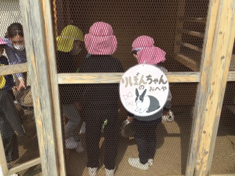 来週で年長さくら組が卒園です。年中たんぽぽ組はウサギ当番を頼まれました。エサと水替え、ウンチの掃除の仕方、ゴミ置き場、手洗い等の仕事を教えてもらいました。
