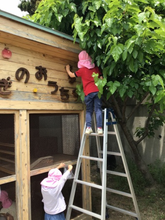 園庭のお山では、桑の木に初めてたくさんの実がなり、ブルーベリーに似た味でとても甘くておいしいです。脚立に登る年長の姿もサマになってきました。