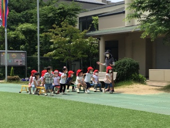 低年齢用の平均台を購入し、年少がそこに並んでかけっこをしました。くぐったり、渡ったり、越えたりとこれから活用の場を広げ、楽しい運動遊びを展開していきたいと思います。