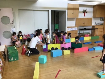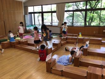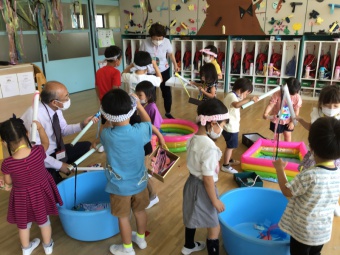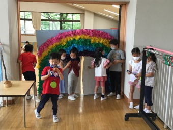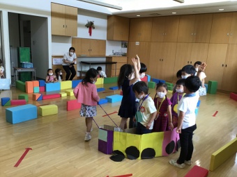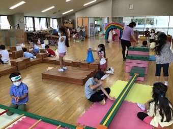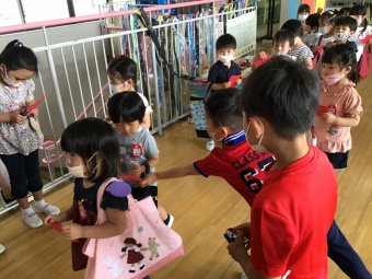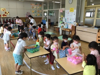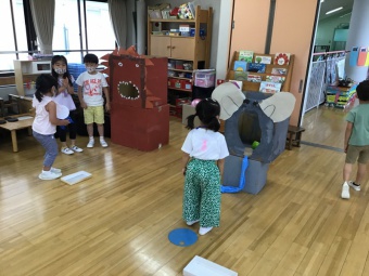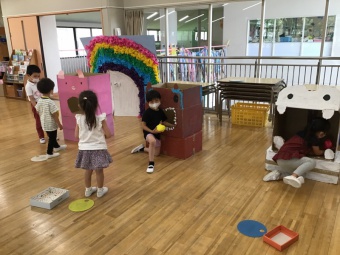 年長さくら組は、遊園地(積み木などで作成)、動物園(段ボールで作った動物に玉入れ)、水族園(釣り竿とバケツと魚を作り、魚釣り)をしました。年中たんぽぽ組は、電車ごっこ(運転士さん、車掌さん以外にも踏み切り役などもありました)と、アイス屋さん(7種類も!)をしました。