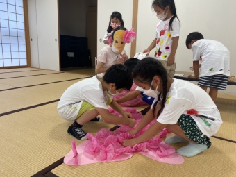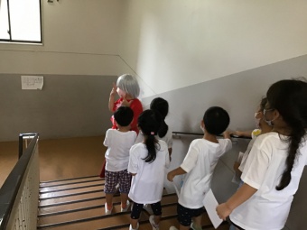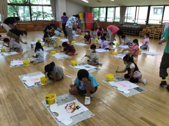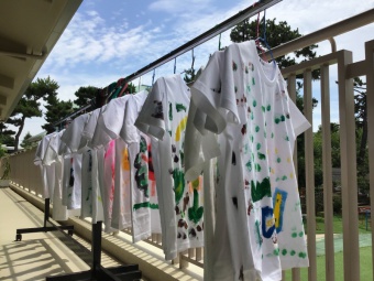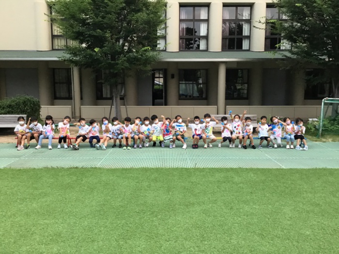 朝、元気いっぱい登園し、Tシャツに絵の具で好きな絵を描いたり、住吉川に遊びに行ったりして過ごしたあとは、朝作ったTシャツを着て小学校に隠れている妖精を見つけにいく探検をしたり、夜はみんなで花火をしたりして楽しい1日を過ごしました。