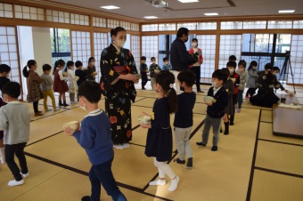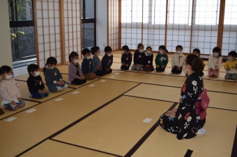 今日は小学校の和室で「たけのこ」があり、礼儀作法を学びました。
