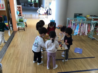 年小すみれ組 ブロックもままごとも全部拭くよ
