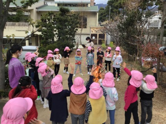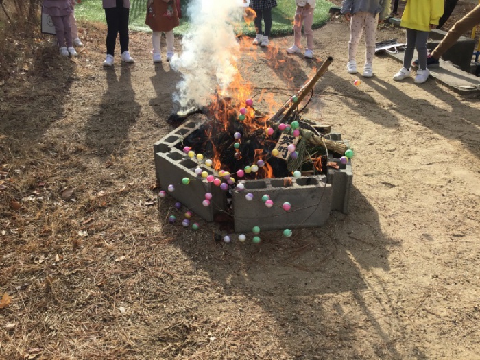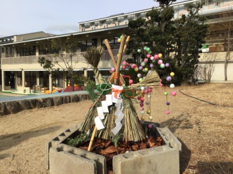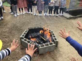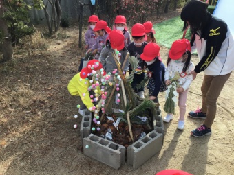 1月13日(金)に、『とんど』を行いました。園庭のお山で行う小さなとんどではありましたが、しめ縄や各クラスで作ったもち花を燃やし、今年1年病気や怪我をせず元気に過ごせるようにと年神様を見送りました。