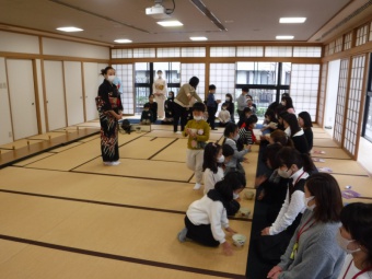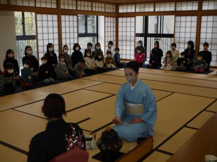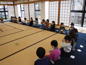 今日は礼儀作法たけのこの最終回でした。1年の締めくくりとして年長・年中組は保護者の方に来ていただき、お茶会を行いました。