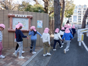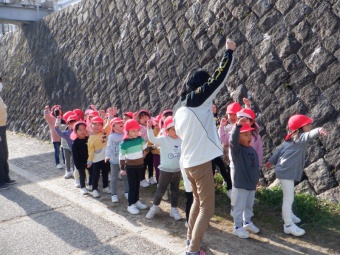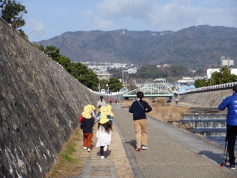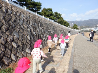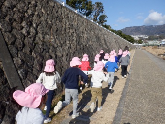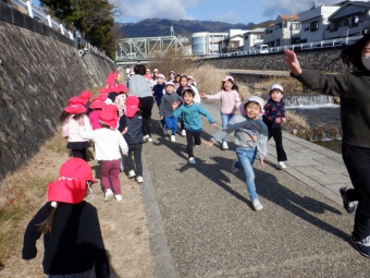 3学期に入り、体力作りとして園庭でマラソンをしていますが、今回『がんばりマラソン』として住吉川沿いを学年ごとに距離を変え2回行いました。
