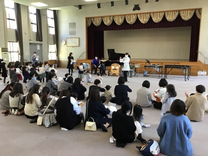 1部では未就園児と年少すみれ組を対象とした演奏でした。子どもたちがよく知っている「夢をかなえてドラえもん」から始まり、「おもちゃのチャチャチャ」や「アイアイ」「アンパンマンマーチ」「ドレミの歌」など、どれも親しみのある曲ばかりで大喜びな子ども達でした。