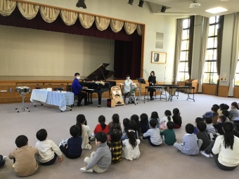 主に東京を拠点とし、テレビ出演や全国の小学校、幼稚園でコンサートや芸術観賞会の出演に大忙しなフラワービートさん。10月には本校でも芸術鑑賞会にお越しいただきました。今回は、未就園児親子と園児を対象に楽しいリズムコンサートをしていただきました。