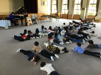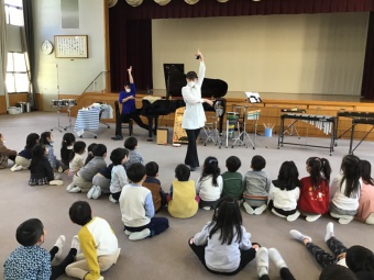 2部では年中たんぽぽ組、年長さくら組を対象とした演奏をしていただきました。1部と同じく子どもたちが大好きなドラえもんの歌から始まり、「剣の舞」の演奏に圧巻されたり、「星に願いを」の静かな演奏では寝転んで目をつぶって聴いたり、「ミッキーマウスマーチ」をボディパーカッションで音を奏でたりと、全身を全て使ってリズムや音、拍を感じました。