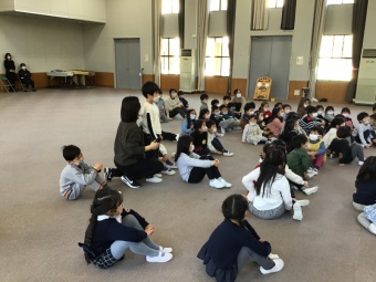 また、紙を1人1枚持って、紙を叩いたり、パンチしたりしと、曲に合わせていろいろな叩き方で音を出しました。「紙」から音が鳴ることや友達と合わせると一体感が生まれることなども感じた瞬間でした。