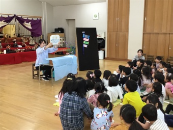 当日は端午の節句の由来や、菖蒲の花、柏餅などについてのお話を聞いたり、クイズをしたりして盛り上がりました。そして、最後にみんなで「こいのぼり」の歌を歌いました。