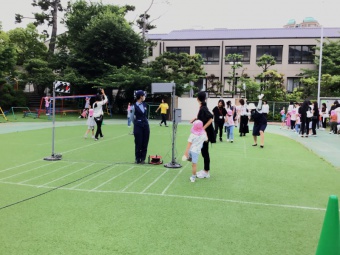 そして、園庭で親子で歩行訓練も行いました。指導員の方に教えていただいた「右、左、右」で車が来ていないか見て、手を上げて上手に横断歩道を渡ることができました。
