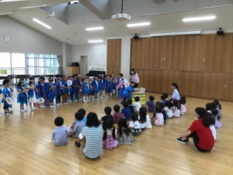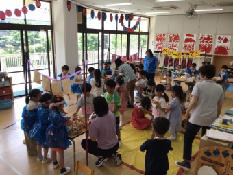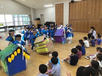 そして今日、いよいよ本番です!年少すみれ組、年長さくら組にチケットを持って行き「たんぽぽだんじりまつりに来てください!」と招待しました。そして順番に2部制でおまつりを行いました。