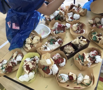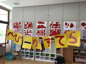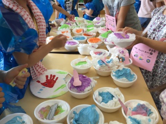 それぞれのお店のグループごとに毎日準備を進めました。「たこやきのソースを塗りたいから茶色の絵の具をください!」「かきごおりの味つけをするから○色と○色の絵の具を用意しよう!」「ベビーカステラは顔を描いて、それが当たりってことにしよう!」と自分たちで考えたり、工夫したり、試行錯誤しながら作りました。時には意見がぶつかったり、「私が!」「僕が!」と言い合いになることもありましたが、それも経験です。自分の思いだけでなく、友達にも思いがあることに気付いたり、その思いや考えを取り入れようとする姿が少しずつ見られるようになりました。