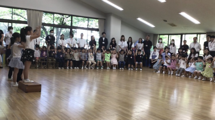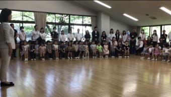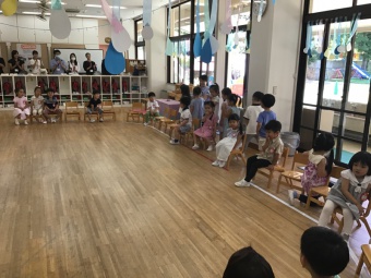 遊戯室の朝の会では、子どもも大人も互いに笑顔で気持ちの良い挨拶をしようという話や、レタス・アボシメロン・スイカの話がありました。遊戯室いっぱいに保護者の方が見てくださっていましたが、子どもたちはしっかり座って話を聞くことができました。