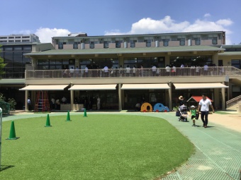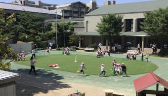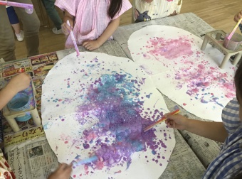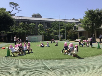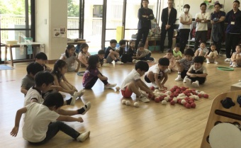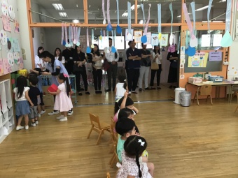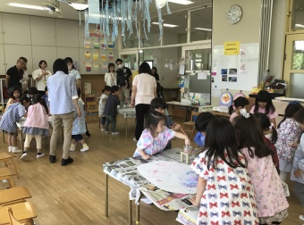 年少すみれ組は階段の降り方、朝の身支度や出席確認、歌を歌う等皆で過ごす日頃の様子を。年中たんぽぽ組は、参観日前からいく日かかけて雨の様子を保育室に作っています。参観では、アジサイをグループで作る様子を。年長さくら組は、グループで協力し合って様々な競争に取り組む様子を、それぞれ見ていただきました。